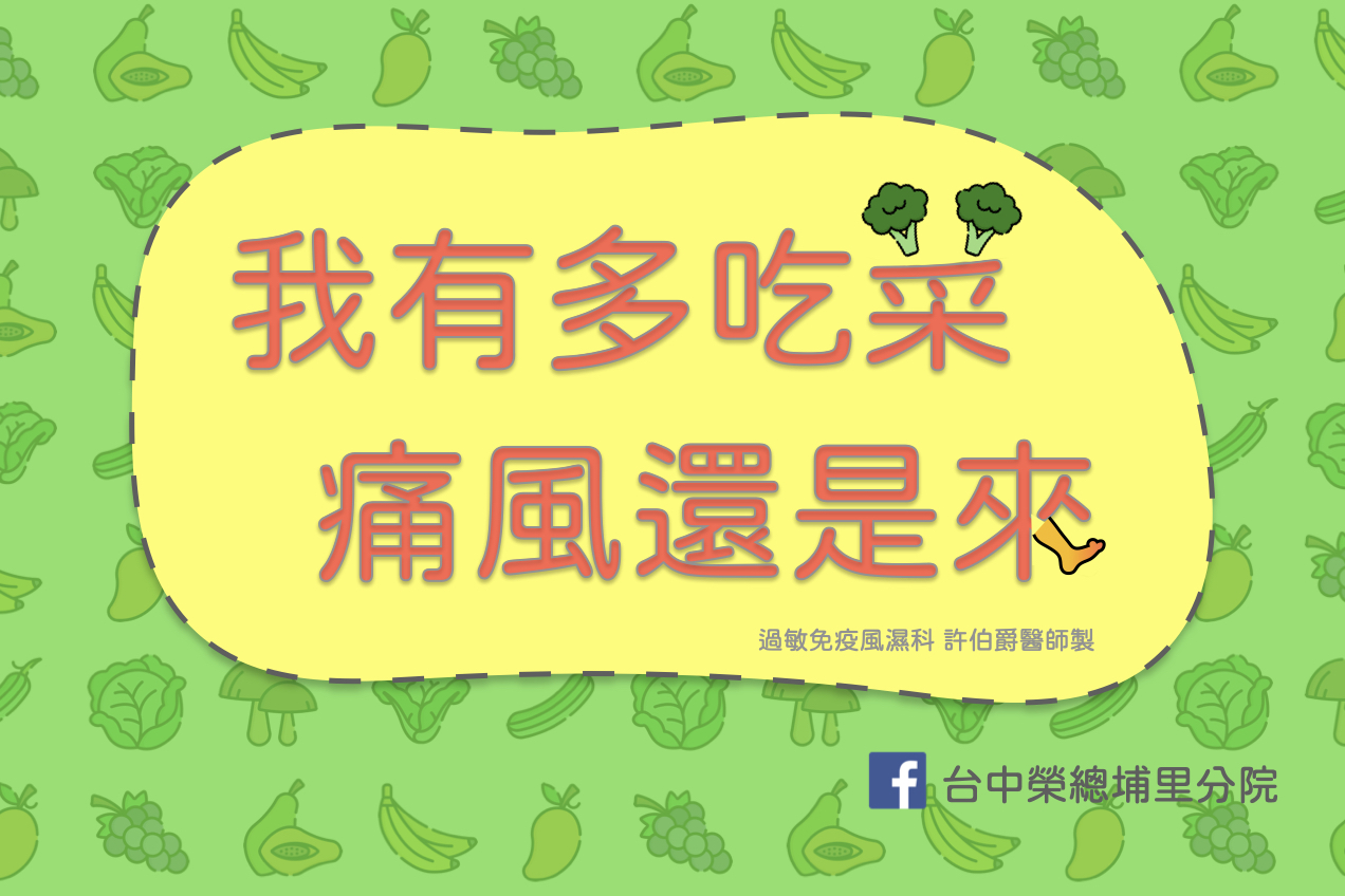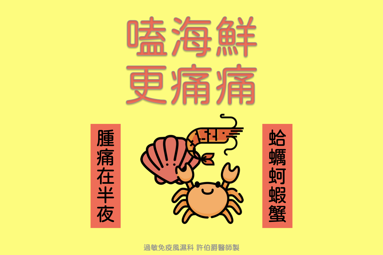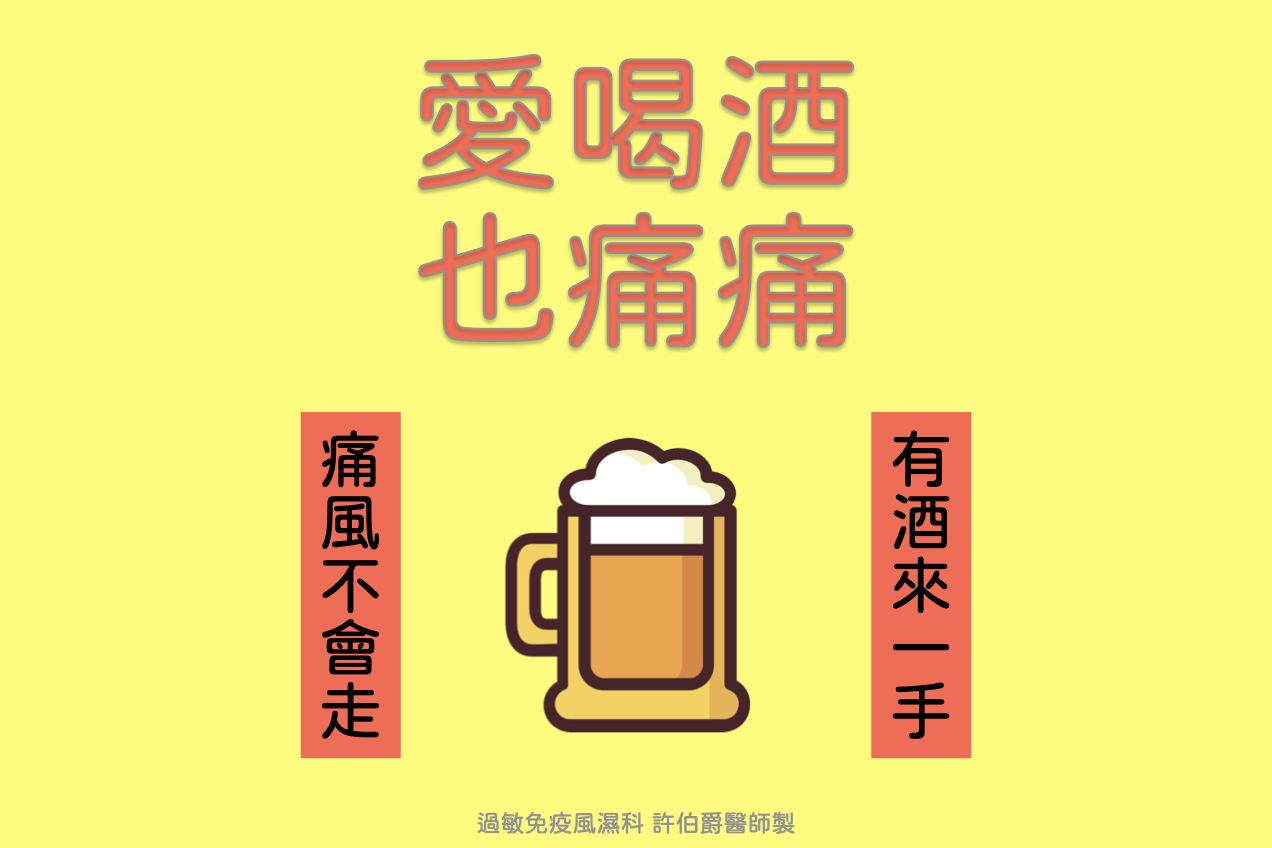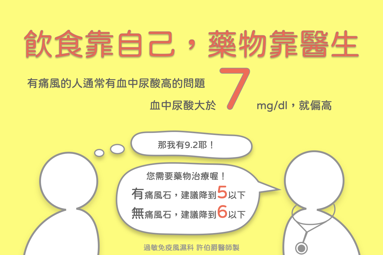 如果您已經有痛風,請記得痛風不是只有消炎解痛,要控制痛風發作,少吃海鮮跟肉,不要喝酒,不要喝含糖飲料,檢驗自己是否合併高尿酸血症,聽醫師的建議使用降尿酸藥物,長期控制尿酸,必須達到您的狀況所建議的目標,才有長期保養身體的功效。