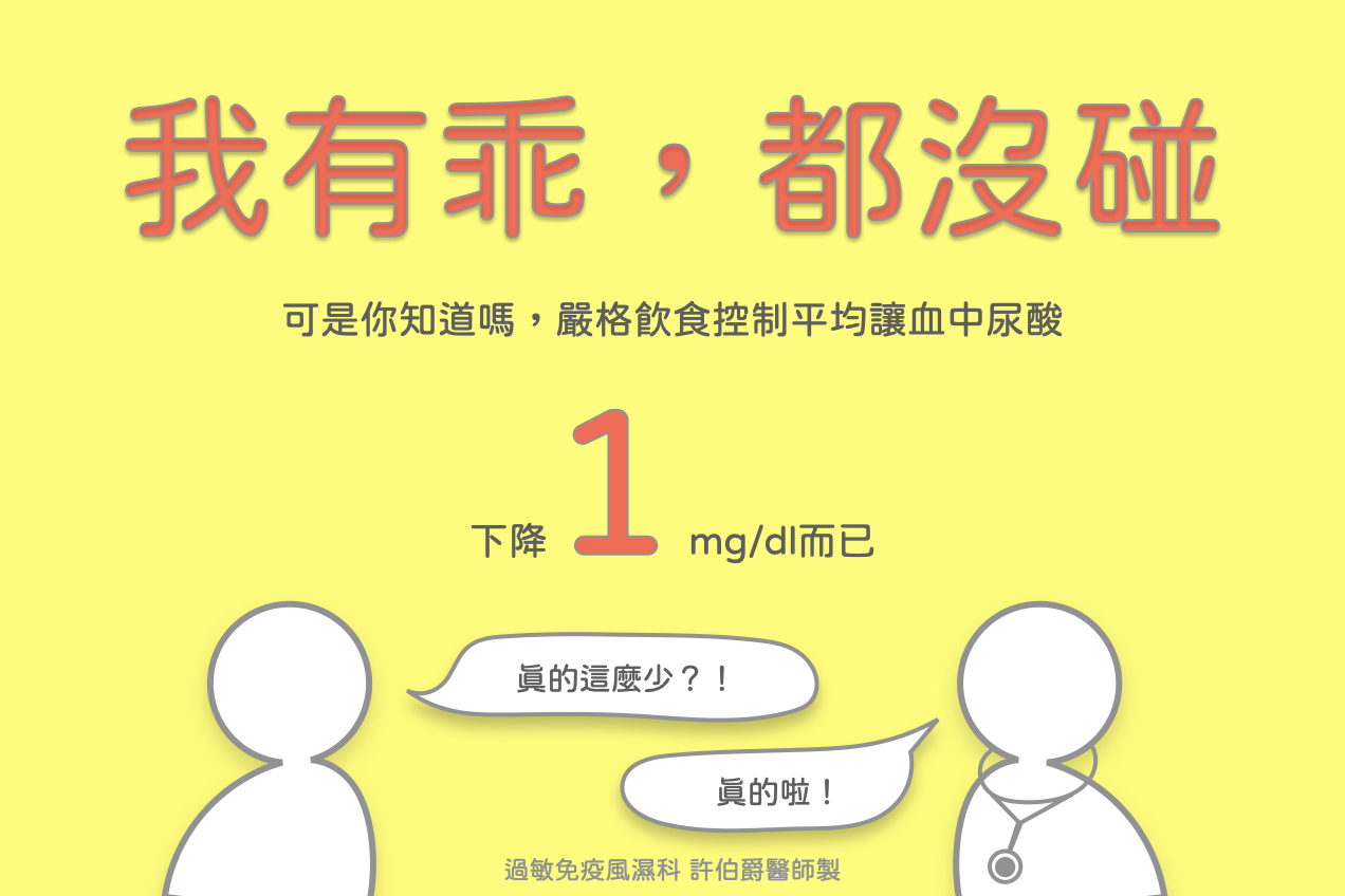 已經發現自己有血中尿酸偏高的高尿酸患者,能不能透過飲食控制,讓尿酸下降,避免痛風發作或產生痛風石呢?這個問題也有醫學團隊透過研究來回答,研究團隊納入兩組受試者,一組長期飲食控制,另一組則不強制飲食控制,結果有飲食控制的人相較於沒有控制的人,血中尿酸平均下降1 mg/dl。意思是飲食控制能夠達到尿酸下降的幅度很小,常常不能夠單靠飲食控制達到治療目標,概念上很像某些糖尿病患者即使很努力的飲食控制仍然血糖偏高。但是這個結論並不是要讓病患放棄飲食控制,而是想要讓尿酸下降「不能單靠飲食控制」,因為高尿酸血症並不是一個飲食異常造成的疾病,這是一個代謝異常造成的疾病,許醫師常打個比方,一樣是吃了一隻蝦子,普林吃下肚後分解產生尿酸,在一般沒有尿酸問題的人很快把尿酸代謝掉,但是有高尿酸血症的患者偏偏會讓尿酸留在身體裡面,無法有效率的代謝尿酸,長期下來尿酸可能沈積在關節或是其他組織裡面,產生痛風的症狀。問題不完全在吃的東西,即使只是吃少少的普林類食物,代謝不掉才是大問題。