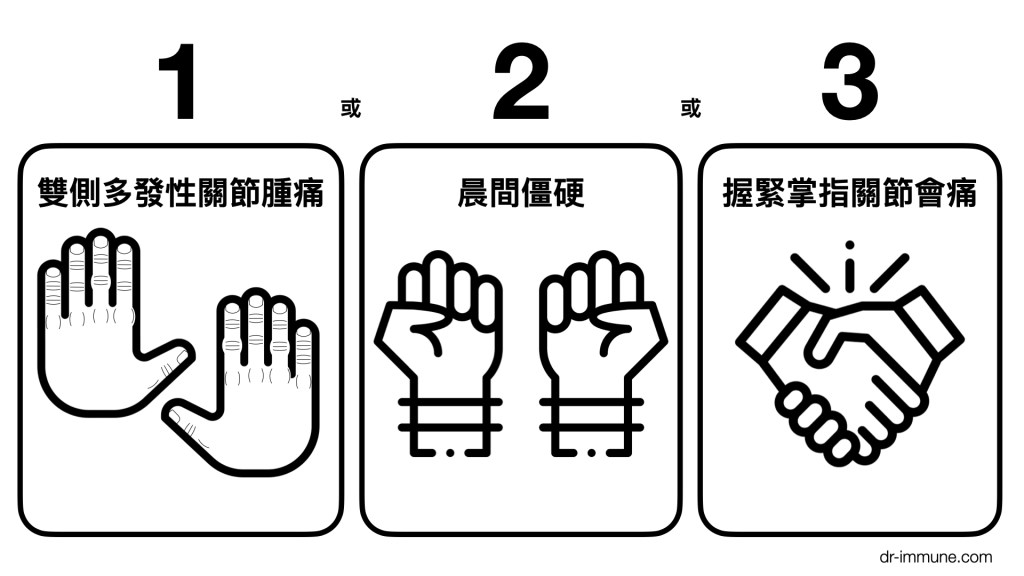 民眾如果有懷疑自己是不是類風濕性關節炎,可以自己用以下三個方式自我檢視:
