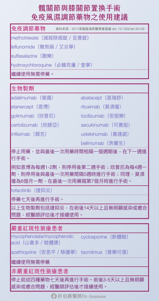 髖關節與膝關節置換手術前後,該不該繼續使用免疫風濕調節藥物,還是應該先停藥等手術後再考慮用藥呢?相信很多病友在面臨手術時會遇到這樣的問題,對於外科醫師來說,使用免疫藥物總得擔心病人是否有容易術後傷口感染的風險,但是停藥又得擔心原本免疫風濕疾病發作的問題,到底怎麼樣做最好?