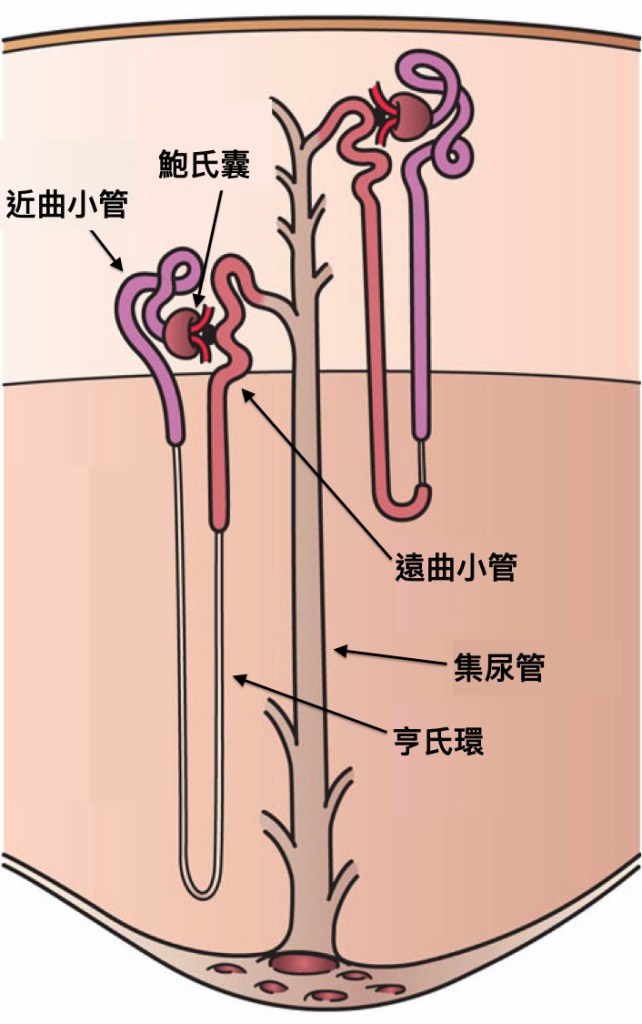 腎臟的濾網叫做鮑氏囊,血管流進去鮑氏囊後會形成一個很細很曲折的路線,像是淨水器裡面的濾心棒一樣,然後把濾掉不要的東西收集到近曲小管裡面。