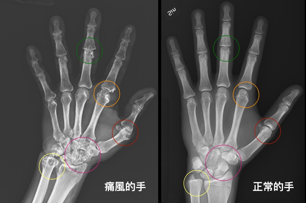 以左手為例,在左手的手腕骨有多處的痛風石侵蝕,造成骨頭多了好幾個洞,像是起司一樣。在左手大拇指、食指、中指的關節(圈選處)也都留下了侵蝕的痕跡。至於右手,痛風石也留下多處的關節侵蝕,右手腕的關節面也變窄了。