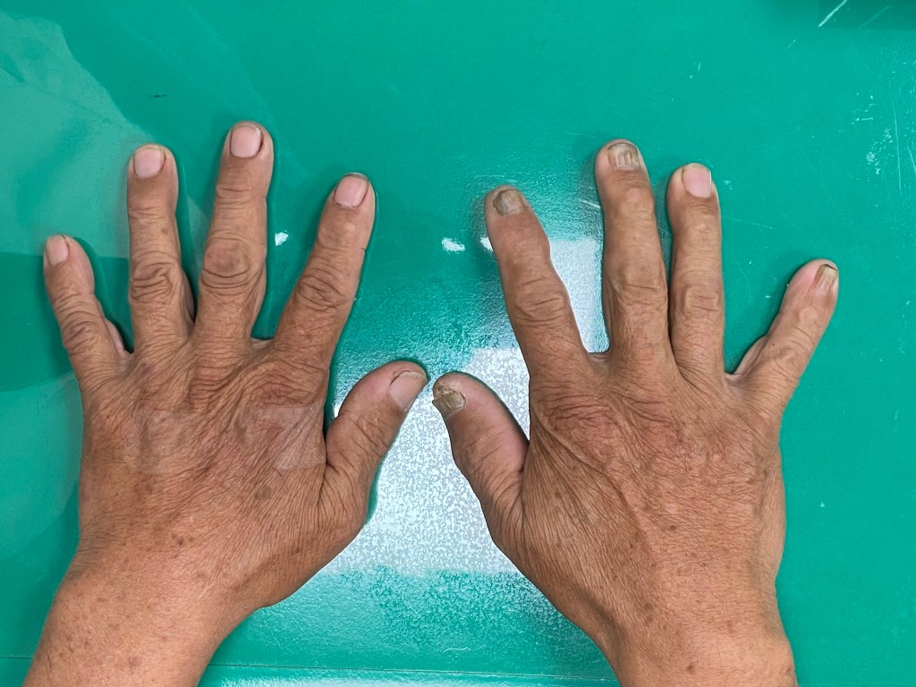 痛風石是真的都消失了沒錯,P先生的身上已經沒有摸得到的痛風石了,不過當年大到讓P先生無法握拳又無法併指的痛風石們,還是在P先生的手上留下不能抹滅也無法回頭的傷痕。