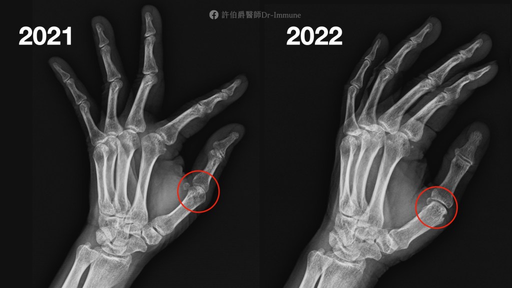 跟2021年相比,2022的X光在左手拇指掌指關節處出現新的關節侵蝕與關節狹窄。
